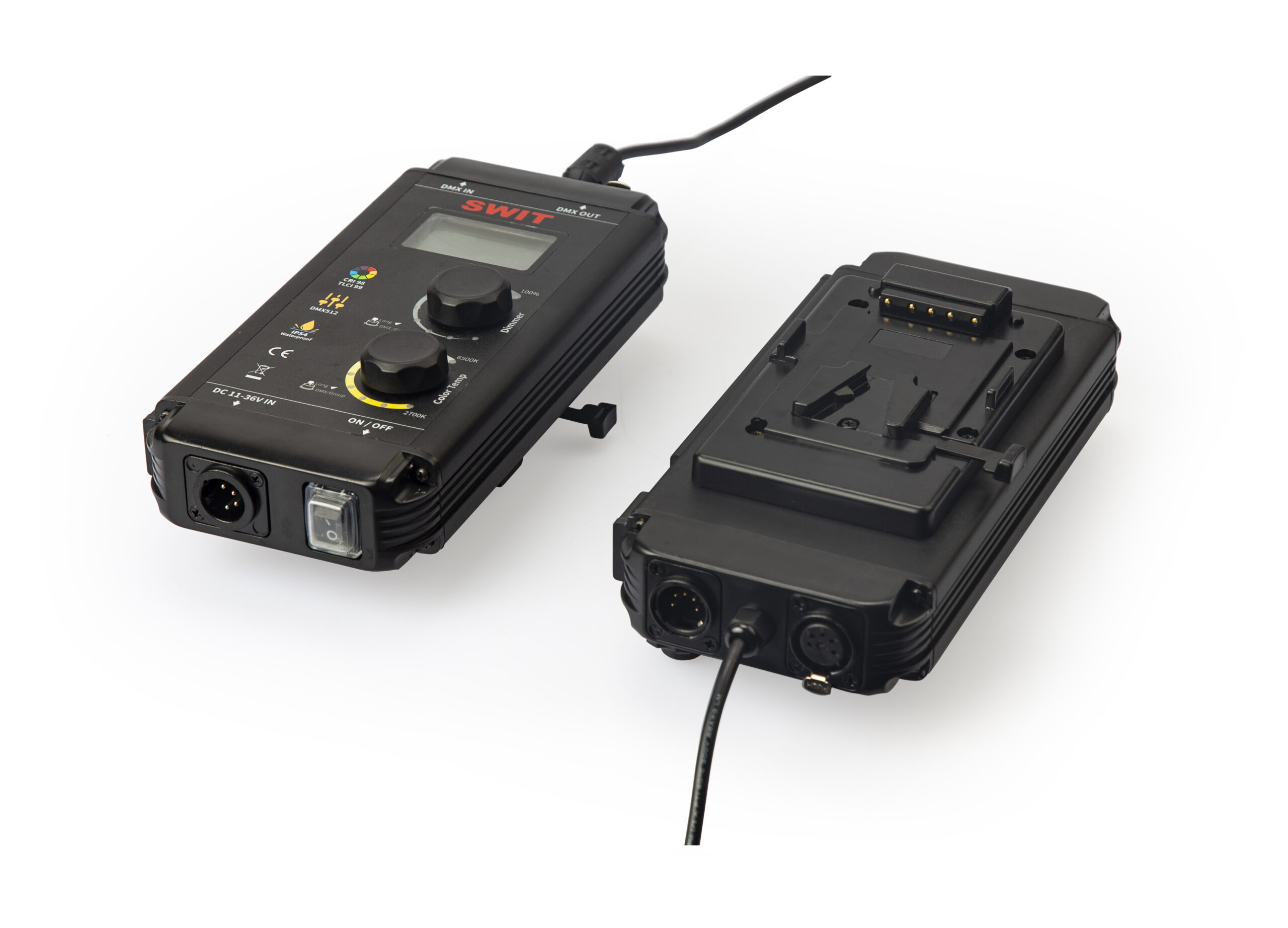 De SL-100P controller biedt dimmer- en kleurtemperatuurknoppen, een LCD-scherm, een V-mount batterijplaat, een 11–36V 4-pin XLR DC-input, 5-pin XLR DMX in/uit en 5V USB-voeding voor een draadloze DMX-adapter.